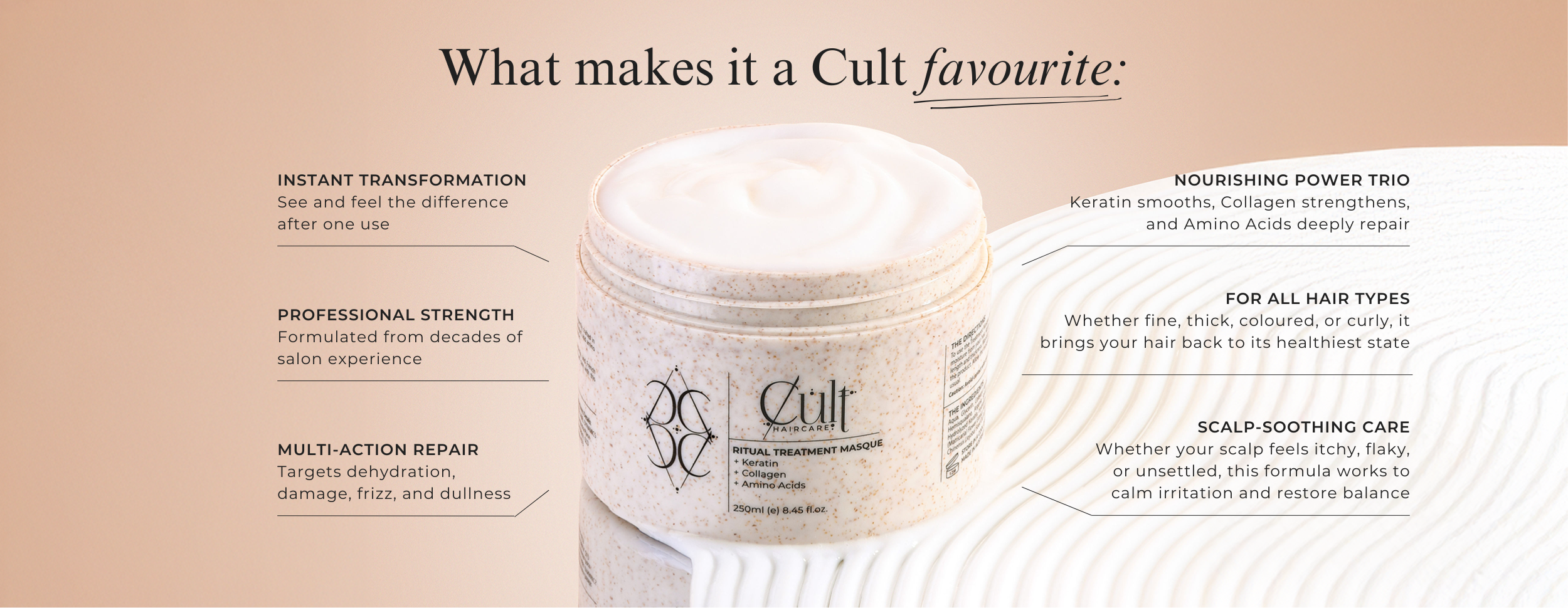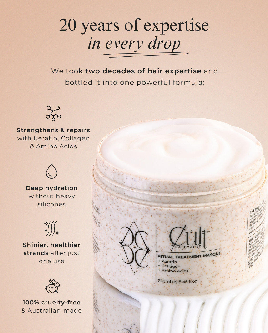 Developed with over 20 years of professional salon expertise, the Ritual Treatment Masque integrates bioactive Keratin, Collagen, and Amino Acids into a scientifically formulated complex that reconstructs the hair's internal structure, restores tensile strength, and enhances surface smoothness.